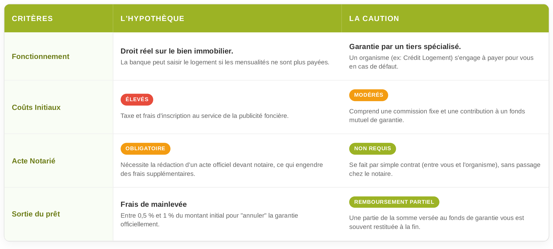 La caution une alternative à l’hypothèque, assurée par des organismes spécialisés. Elle ne nécessite pas d’acte notarié et une partie de la cotisation peut être remboursée en fin de prêt. Privilégier une caution à une hypothèque permet souvent de réduire les frais de votre rachat de crédit.